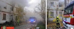 Original Einsatzbericht der Feuerwehr Quedlinburg: Anrufer meldeten bei der Leitstelle Rauch aus zwei aneinander gebauten leerstehenden Gebäuden im Neuen Weg. Bei Eintreffen der Feuerwehr konnte dies bestätigt werden. Offene Flammen waren nach außen nicht sichtbar. Ein Trupp ging unter schwerem Atemschutz mit einem C-Rohr in das Objekt vor um den Brandort zu lokalisieren. Parallel wurden eine Steckleiter und der Teleskopgelenkmast in Stellung gebracht. Auf der anderen Seite des Gebäudes bauten die Kameraden aus Gernrode die Drehleiter auf. Nach einer ersten Lageeinschätzung durch den Einsatzleiter und die weitere Zunahme der Rauchentwicklung, forderte dieser Atemschutzgeräteträger aus den Wehren aus Rieder und Ditfurt nach. Ein zweiter Trupp verschaffte sich eine weitere Zugangsmöglichkeit in das Gebäude und ging dem ersten sich im Haus befindlichen Trupp entgegen. Das Feuer konnte schließlich in der Mitte eines langgezogenen Flures zwischen den zwei Häusern im 1.OG und teilweise auf das 2.OG übergreifend festgestellt und bekämpft werden. Um Abluftöffnungen zu schaffen schlug ein Kamerad über die Drehleiter bzw. den Teleskopgelenkmast die Scheiben ein. Die Wasserversorgung stellten zwei Unterflurhydranten sicher. Bei den Nachlöscharbeiten mussten Teile der Decke und Wandverkleidungen entfernt werden. Insgesamt wurden 11 Atemschutzgeräte genutzt, wobei bei mehreren die Flaschen getauscht wurden und die Trupps nochmals in das Objekt gingen. Bilder von der Ortsfeuerwehr Quedlinburg